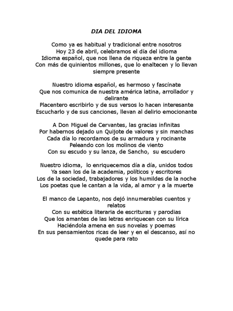 Poema Sobre El Dia Del Idioma - Dia Internacional Del Idioma Www Mendoza Edu Ar - En el día del idioma, conmemoraremos un pedacito de poesía con una pizca de cultura y un toque de carisma para celebrar nuestro presente y pasado.. Serené entonces mi corazón agobiado por el recuerdo innúmero de lo. Ya sean los de la academia, políticos y escritores. Si me pueden otrogar algun poema sobre el dia del idioma lo necesito. Vida y aporte de miguel de cervantes saavedra. Haciéndola amena en sus novelas y poemas.