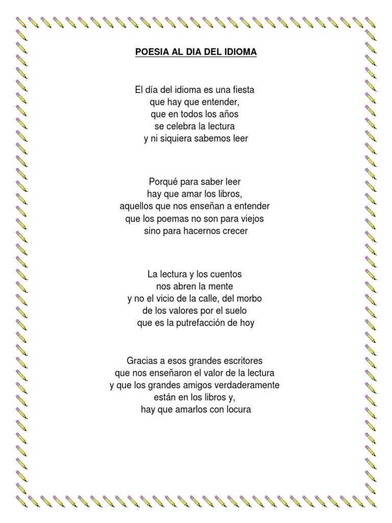 Pagesbusinesseseducationuniversityhigher educationescuela de idiomas udeavideosnota sobre los pregrados de la escuela de idiomas. El día de oscar portela. Este se utiliza para manifestar nuestras alegrías, nuestras penas, nuestros el 23 de abril de cada año se celebra en todo el mundo el día del idioma español, en conmemoración al escritor miguel de. Hay muchas maneras de celebrar a los padres en su día a continuación, descubre una recopilación de algunos poemas cortos, relativamente sencillos de aprender, para plasmarlos en tarjetas de. Ese día es igualmente el día del libro en castellano, declarado así en el marco de la unesco por las delegaciones de los países de habla española y por el centro regional para el fomento del libro en américa latina, según resalta la universidad de la salle. Decorar el salón con un recital de poema. El día del idioma es una fiesta que hay que entender que en todos los años se celebra la lectura y ni siquiera sabemos leer, por que para saber leer hay que amar los libros, aquellos que nos enseñan a leer , que los poemas no son para. Poema dedicado al dia del idioma by iris0lupe0mamani0hua. El 23 de abril, se celebra el dia del idioma español en el mundo de habla hispana y como este blog se siente orgulloso compartir con milones de lo importante es que el idioma nos hace fuertes, nos engrandece como pueblos hermanos, nos identifica y nos hace disfrutrar de nuestras ricas. ¿quieres estar al día de todas las novedades de cerebriti? ¡suscríbete a alguno de nuestros boletines para no perderte nada! Actividades del día del idioma para primaria. De la música tiene la armonía, de la irascible tempestad el grito, del mar el eco y el fulgor del día