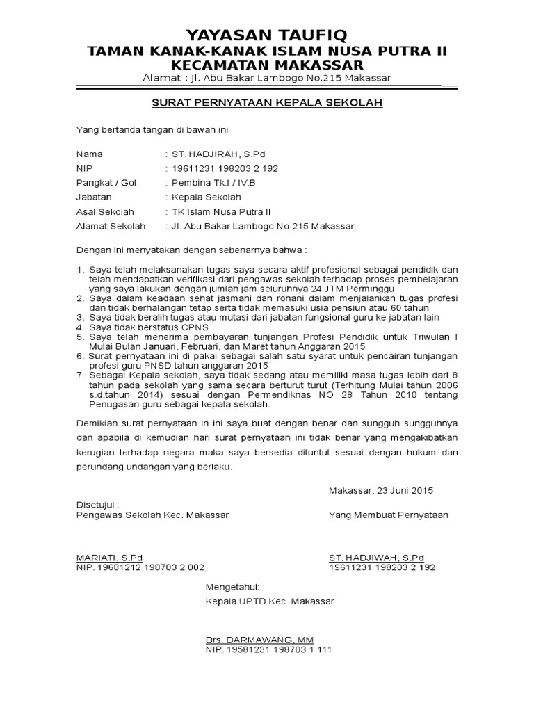 0185.a/h.06/sma.01.04/mn/2010yang bertanda tangan di bawah ini:n a m a: Karena suatu surat pernyataan ini bersifat remi maka beberapa hal yang harus di lengkao dalam membuatannya, seperti kop surat. Salah satu impian guru adalah menerima tunjangan sertifikasi. Pengertian kepsek, guru, kompetensi pendidikan dan pelatihan. Jamade, m.si.n i p :
